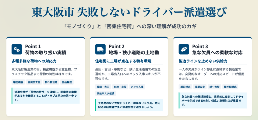東大阪市は、工場密集地ならではの短距離配送・部品輸送が中心で、車両サイズ・荷物特性・地場事情を正しく理解している派遣会社を選ぶことが成功の鍵です。